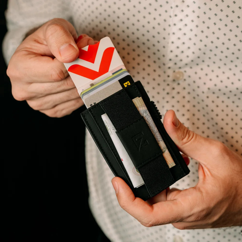Bez obzira da li nosiš jednu ili deset kartica, aluminijumski mehanizam ih drži čvrsto na svom mestu i omogućava ti da ih izvadiš brzo i lako jednim klikom.
